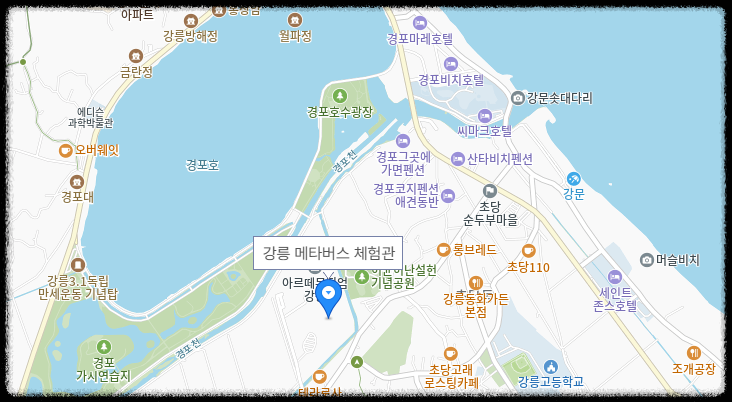 강릉 메타버스 체험관은 경포호수 옆 아르떼뮤지엄과 경포아쿠아리움 근처에 있습니다.