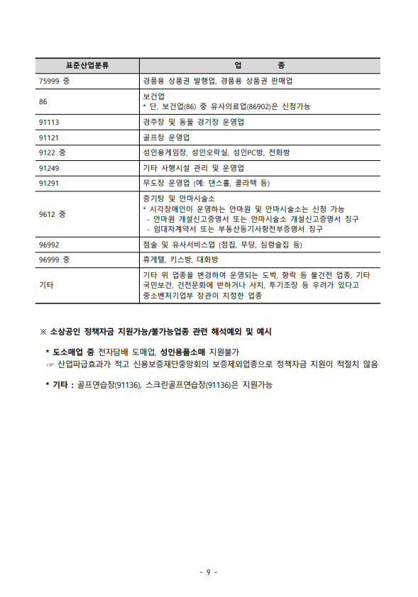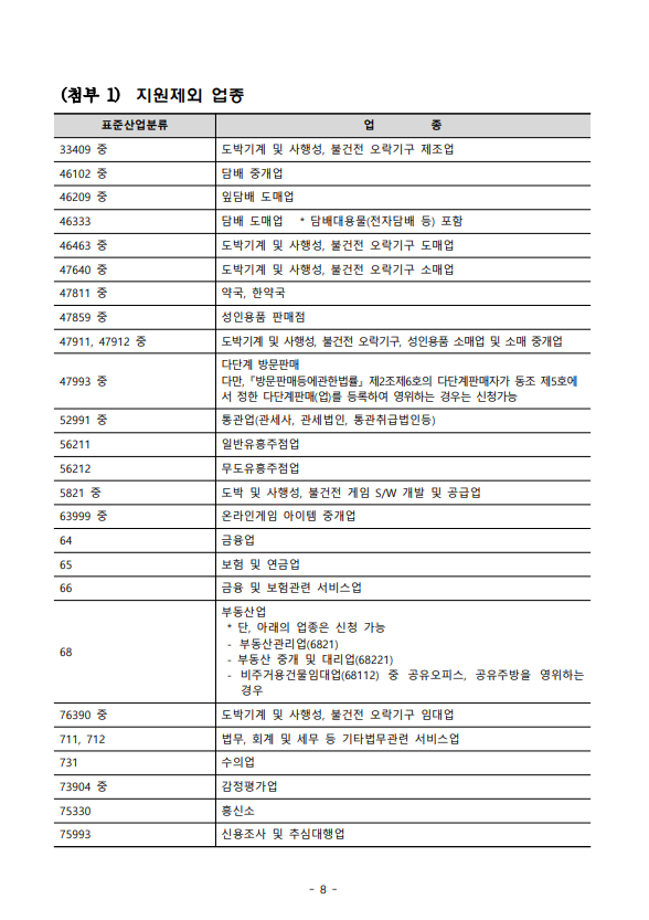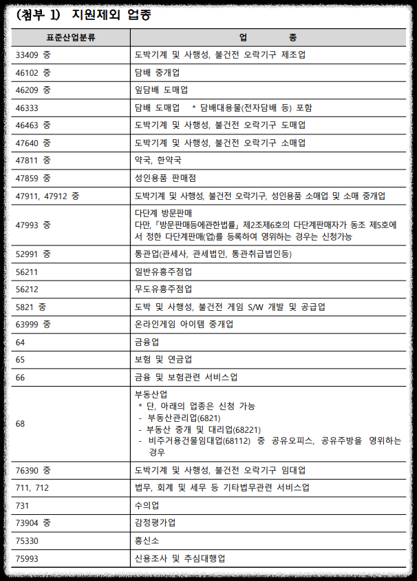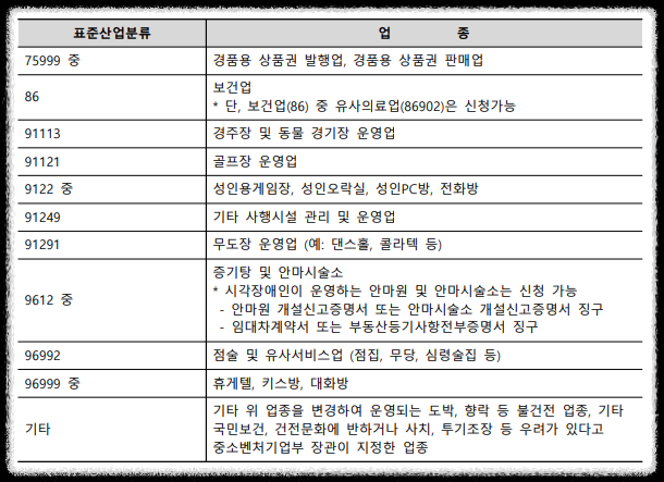 아래 사진을 참고하시고 지원제외 업종에 해당하는지 확인해 보시기 바랍니다.