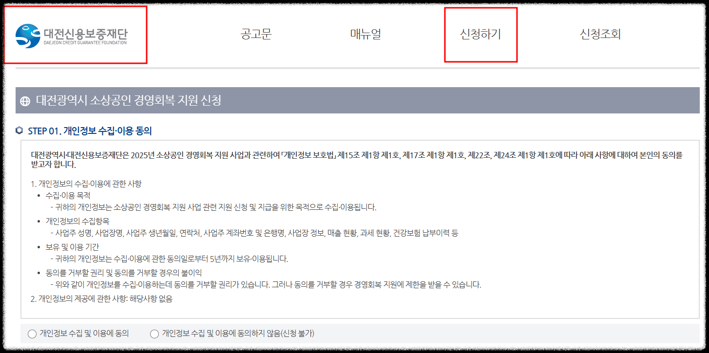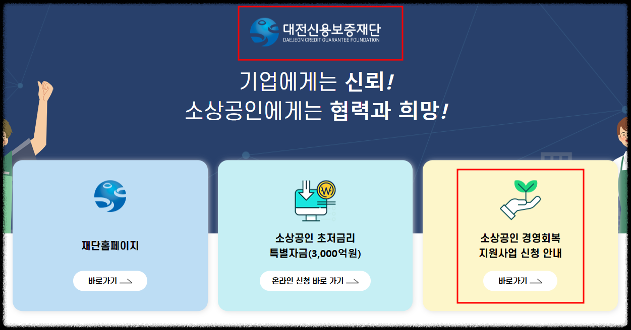 대전신용보증재단에 접속후 소상공인 경영회복지원사업 신청 안내 를 선택합니다.