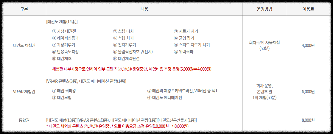 - 이용료가 있습니다. (태권도 체험권 4,000원 / VR 체험권 6,000원)