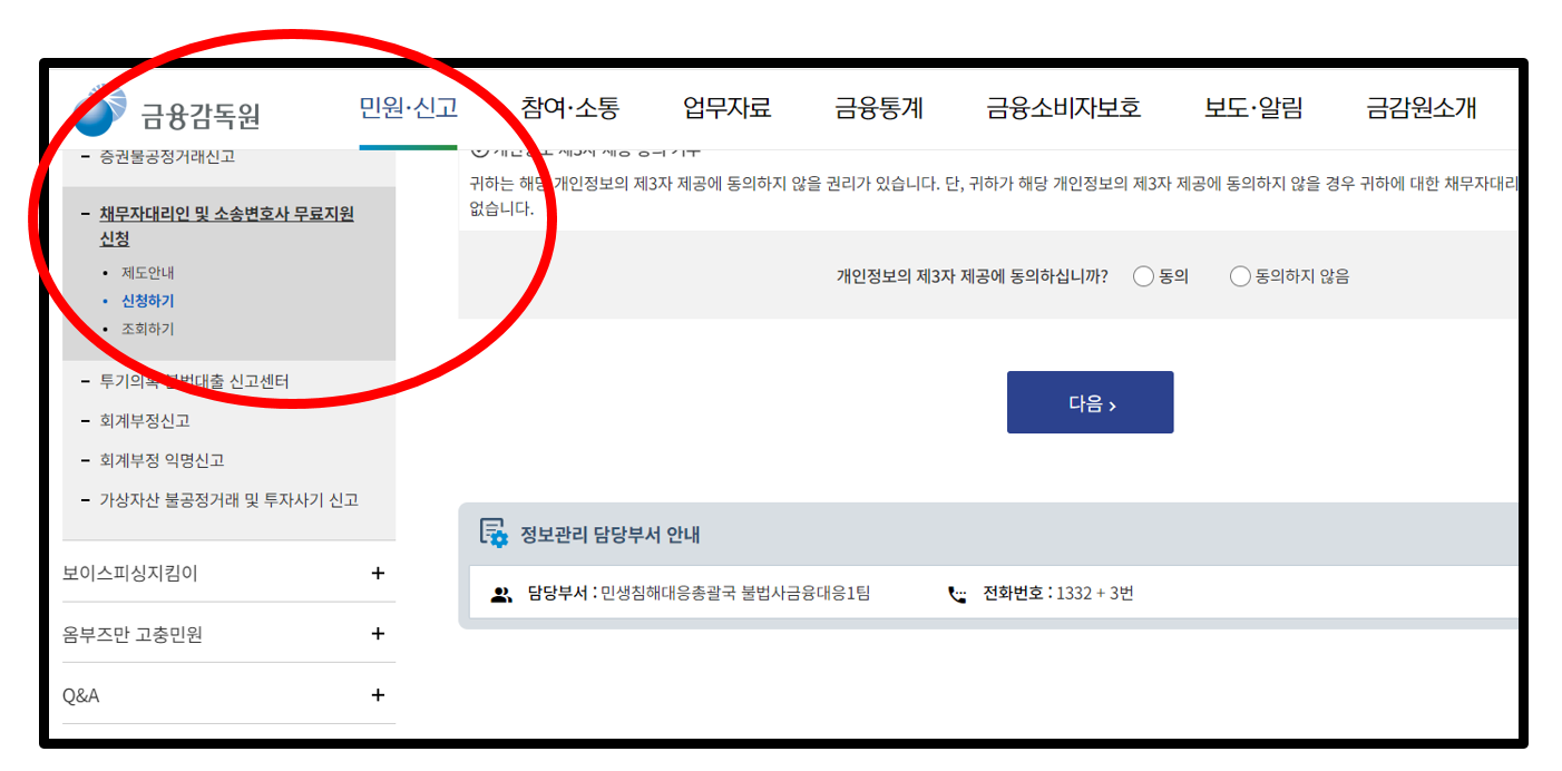 금융감독원 홈페이지에 접속하여 민원신고 - "채무자대리인 및 소송변호사 무료지원 신청" 메뉴를 클릭하면 신청화면이 나옵니다.