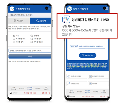 여성가족부에서 제공하는 성범죄자 알림e 어플을 다운받으면 휴대폰으로 내주변 성범죄자를 언제 어디서나 손쉽게 조회할 수 있습니다.