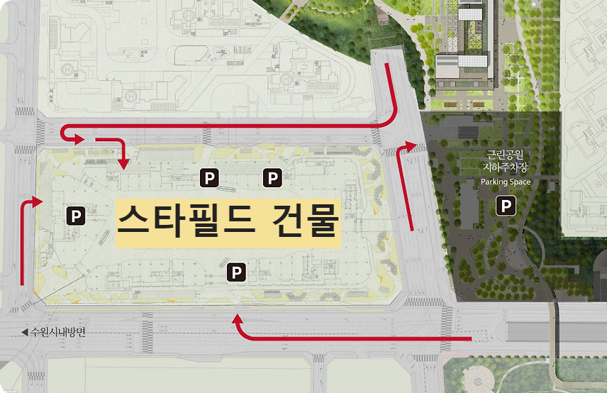 아래 사진에 표시된 스타필드 오른쪽 근린공원 지하주차장 입구로 길안내를 받아야 연결통로를 통해서 스타필드로 바로 들어갈 수 있습니다.