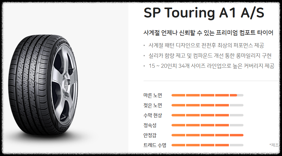 던롭 A1은 안정감이 우수한 프리미엄 컴포트 타이어입니다.