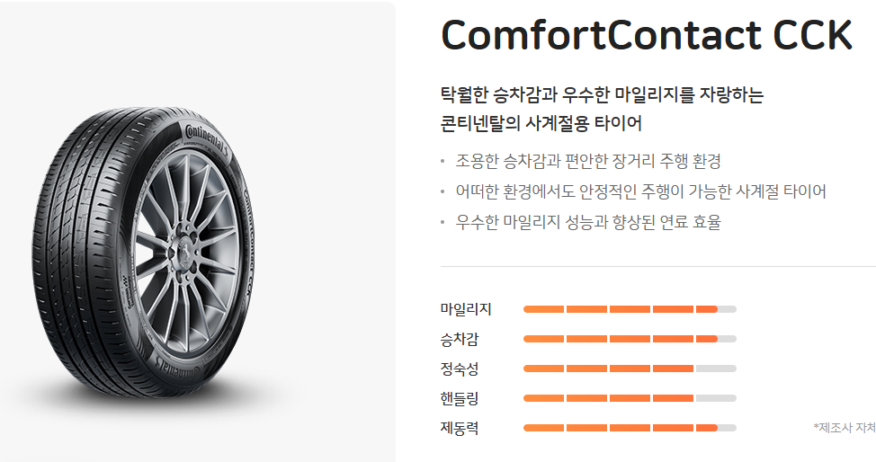 콘티넨탈CCK는 승차감과 마일리지가 우수한 사계절 타이어입니다.