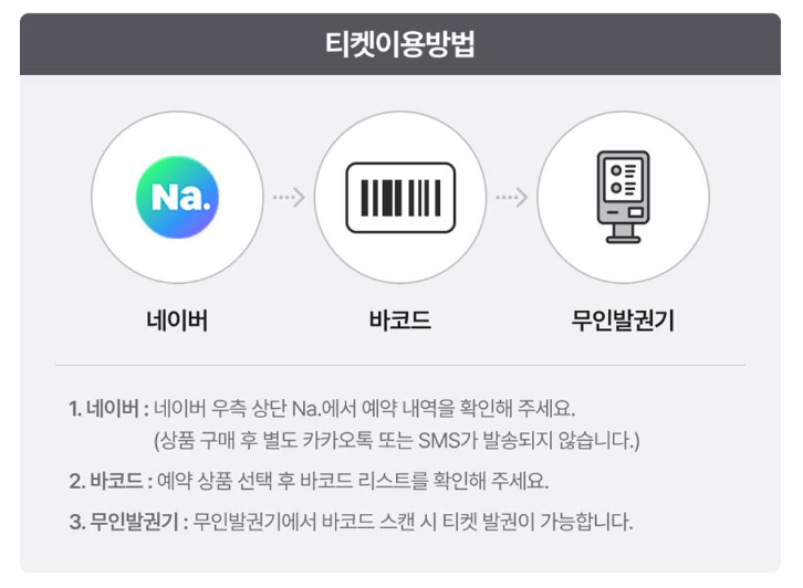 티켓예매후에는 네이버 앱에서 바코드를 실행한 후 현장의 무인발권기에서 발권하면 됩니다.