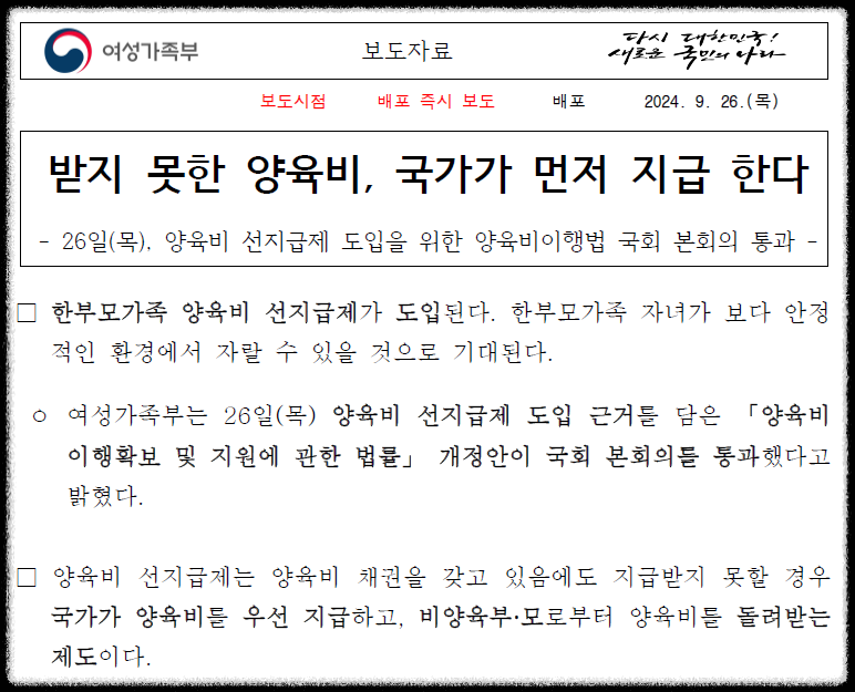 양육비 채권이 있는데도 양육비를 받지 못하고 있는 양육자에게 정부에서 양육비를 먼저 지급하고 비양육자 채무자에게는 추후에 정부에서 회수하는 제도를 말합니다. (아래 보도자료 사진 참고)
