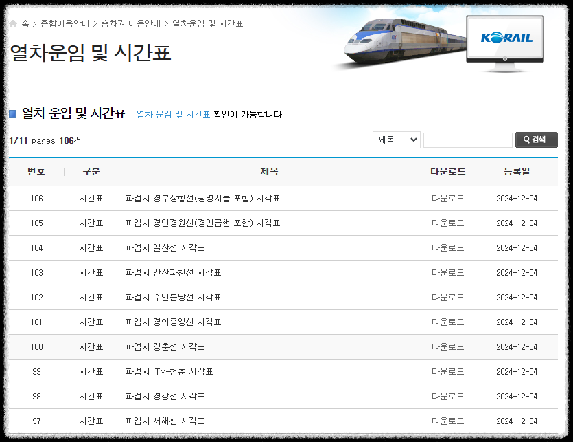 열차의 노선별로 시간표가 올라와 있으며 파일로 다운로드 받을수 있습니다.