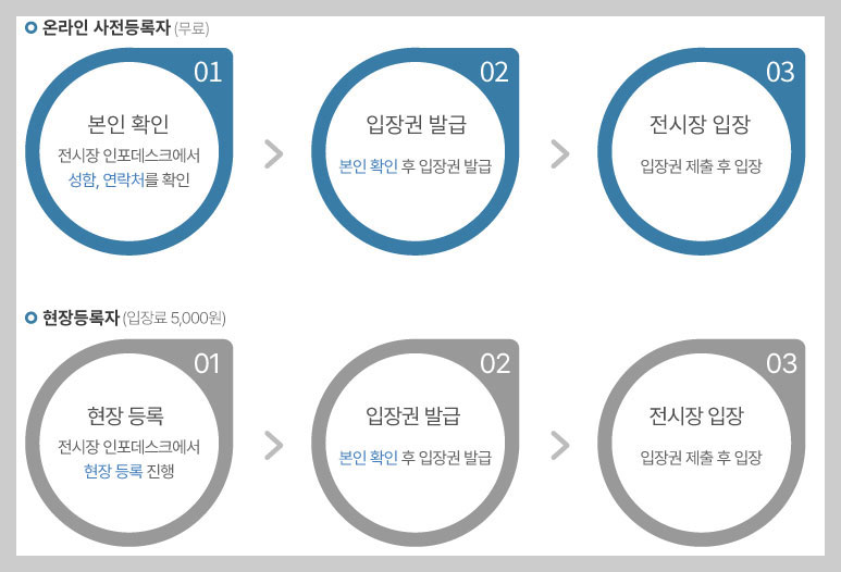 온라인 사전등록은 아래 링크에서 간편하게 등록할 수 있으며 사전등록이 완료되면 전시장 인포데스크에서 성명과 연락처만 확인하고 무료입장 할 수 있습니다.