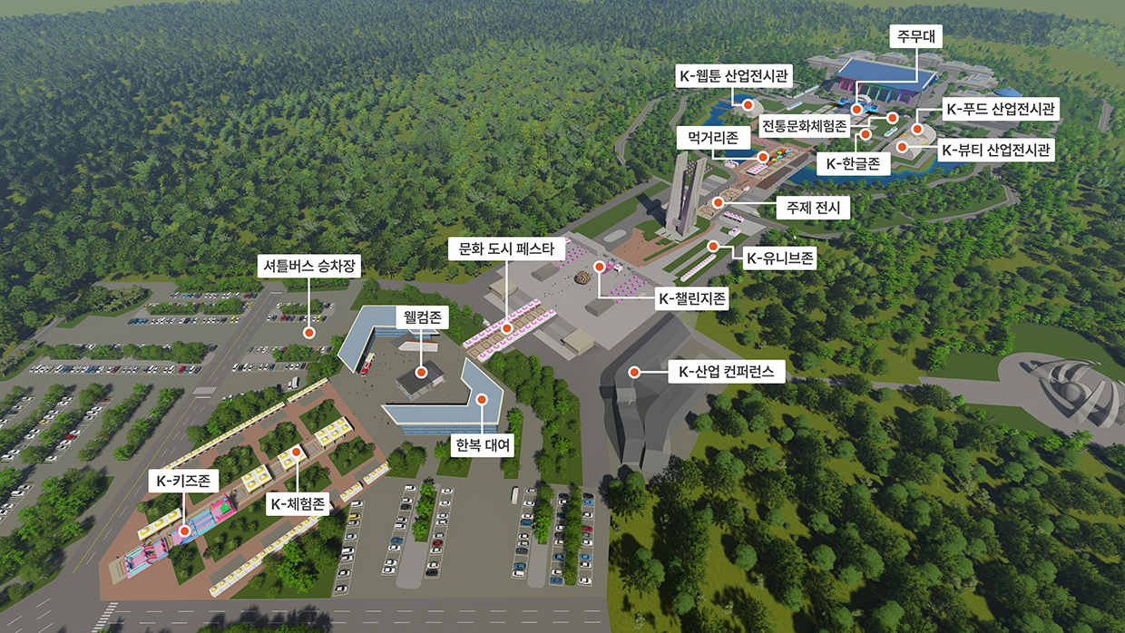 겨레의탑 프로젝션 맵핑, K-푸드 관련 시식/체험행사, K-pop 아이돌 헤어 메이크업 시연, K-웹툰 제작과정 전시 및 코스프레 체험 등 다양한 전시프로그램이 마련되어 있습니다.