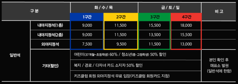 티켓가격은 좌석의 종류와 주중 가격, 주말 가격에 따라서 다릅니다.